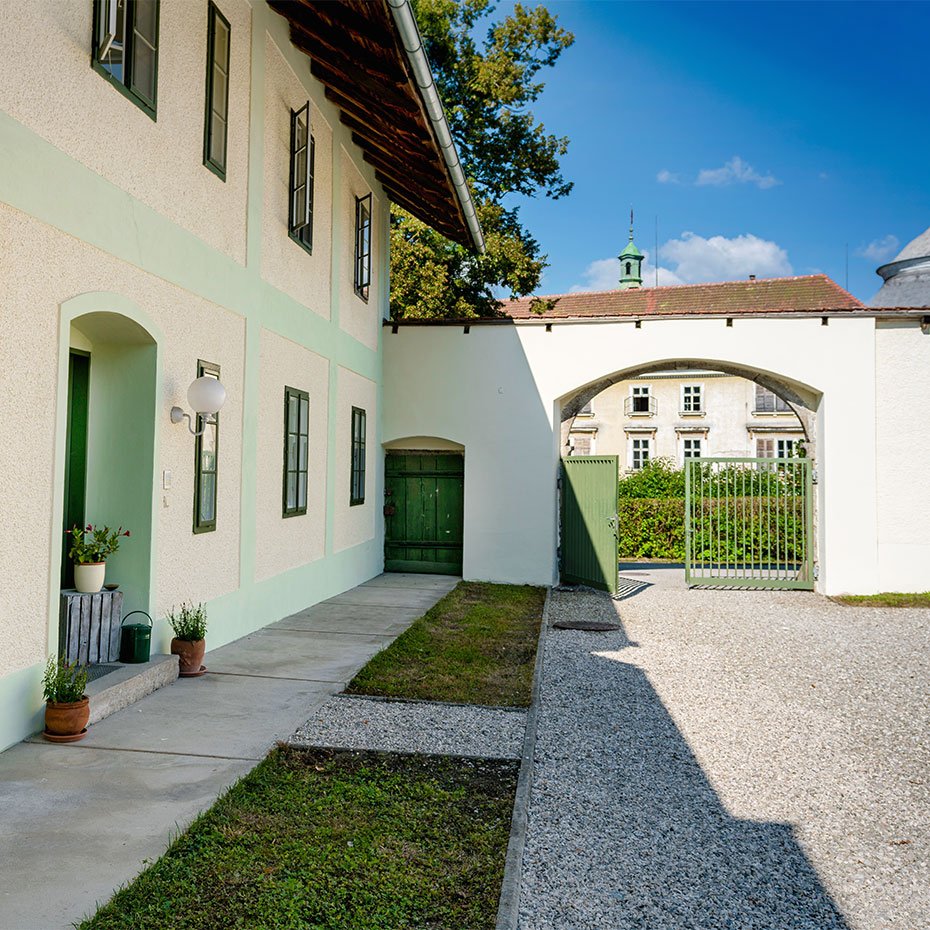 Im Maierhof befanden sich die Stallungen des herrschaftlichen Viehs und die dafür notwendigen Vorratskammern, eine eigene Schlossgärtnerei und die Unterkünfte samt Aufenthaltsräume für die zahlreichen Mitarbeiter, die früher notwendig waren, um die ausgedehnten Ländereinen zu bewirtschaften. Tatsächlich ist es noch bis in die 1950er Jahre so gewesen, dass ein Stammpersonal von gut 50 Mitarbeitern benötigt wurde, um Schloss und Gut zu bestellen, was sich heute natürlich sehr geändert hat. Die wichtigste Person im Maierhof war aber der Wirtschafter, der allgemein respektvoll als “Moa“ bezeichnet wurde und dem die Gesamtleitung der herrschaftlichen Landwirtschaft oblag. So befanden sich auch seine Wohnräumlichkeiten und die Verwaltungskanzlei im Maierhof, sodass er stets mit argwöhnischem Auge alle wirtschaftlichen Vorgänge überblicken konnte, damit der Gutsherrschaft kein Schaden entstehen konnte. Nachdem die Eigenbewirtschaftung der Landwirtschaft in den 1960er Jahren aufgegeben wurde und die Flächen der Verpachtung zugeführt wurden, ist der Maierhof jahrzehntelang, bis Anfang der 2000er Jahre, leer gestanden und wurde dann durch enormen Einsatz von Dr. Heinrich Birnleitner wieder revitalisiert. Er beschloss den Maierhof nutzbar und somit bewohnbar zu machen und baute vier großzügige Wohnungen ein, die er dann zur Vermietung freigab. Besonders ist aber die prachtvolle Erscheinung und Außenhülle des Maierhofes, da die Fassade nach dem Vorbild des Leopoldinischen Traktes der Wiener Hofburg, indem sich heute die Präsidentschaftskanzlei und die Wohnräume des Bundespräsidenten befinden, gestaltet wurde.